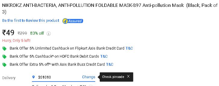 Flipkart is running anoffer on Pollution Mask80% Off@ Rs.49 + 2% dealCorner cashback. No Minimum Purchase Required To Grab dealCorner cashback.Hurry !! Grab Now !!