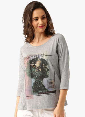 ALL ABOUT YOUGrey Melange Printed T-Shirt