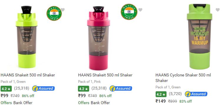 Flipkart is Running An Amazing Offer Where You Can Grab HAANS Shakeit 500 ml Shaker Upto 86% Off At Just Rs.99+ FREE shipping for f-assured. To get this offer here are the steps: