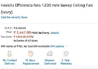 Hii everyone, summers are always irritating, but with this Efficiencia Neo decorative fan, you can say bye bye to hot weathers.You can get Mega cashback On Havells Products, Shop For Rs. 2500 &!! In Today's Offer you can BuyHavells Efficiencia Neo 1200mm Ceiling Fan At Just Rs. 1819.