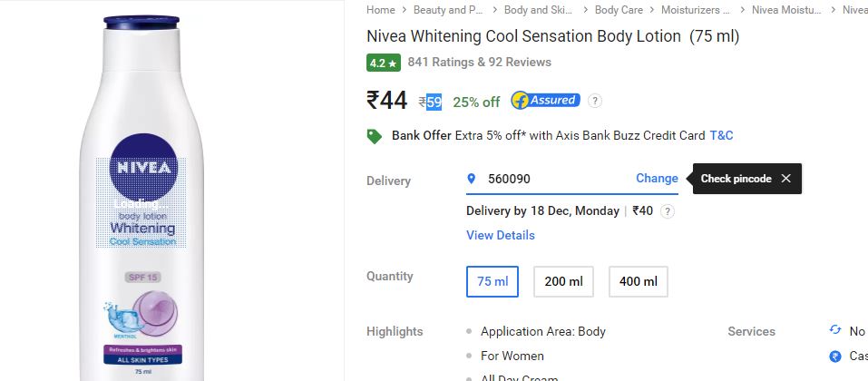 Flipkart ruuning an amazing offer where you can grabNivea Whitening Cool Sensation Body Lotion(75 ml) at Just Rs.44