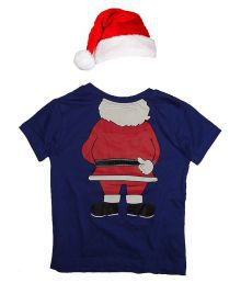 Sonpra Blue Cotton Santa Claus Printed T-Shirt with Red Merry Christmas Cap - 2 Pc