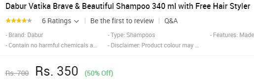 FLAT 50%OFF:-Vatika Brave & Beautiful Shampoo 340 ml + Free styler Rs. 350
